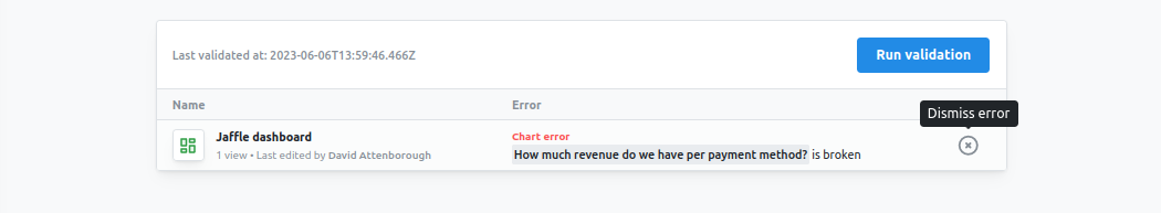 - Dashboards: errors in dashboards are caused when a chart is broken in the dashboard or a filter references a metric or dimension which no longer exists.