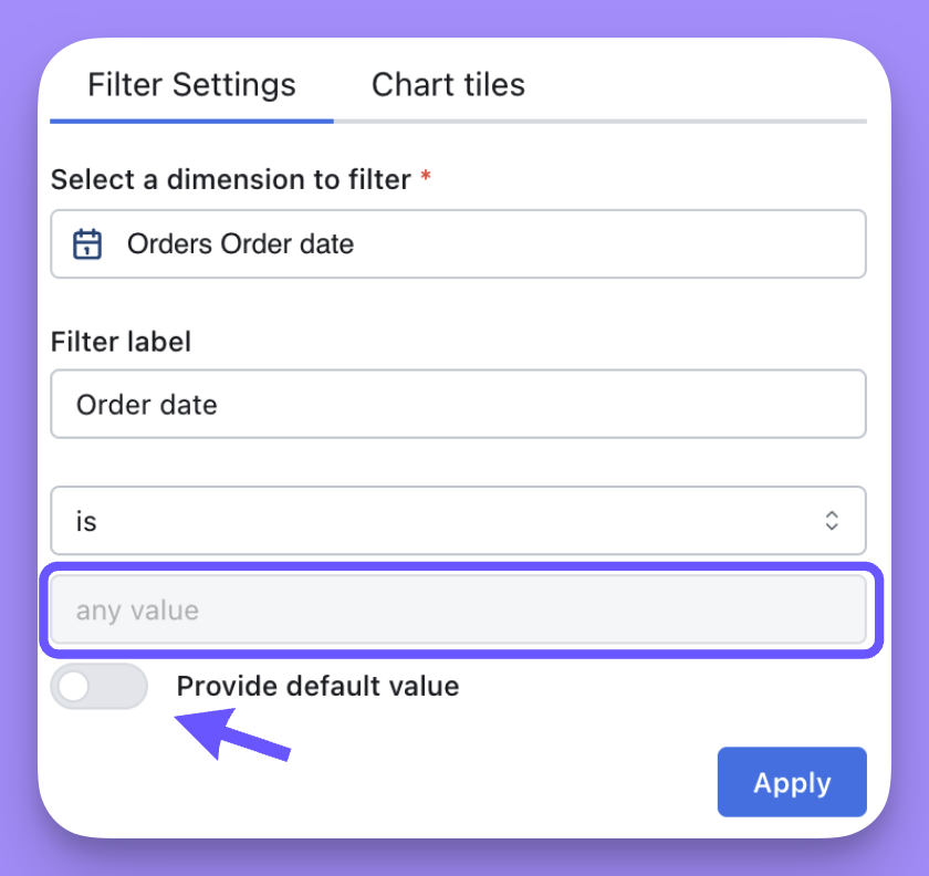 Then, in the Chart tiles tab, you can apply the filter to a SQL chart tile and choose the column you want that filter to apply to. - On a dashboard with only SQL Runner-based tiles, filters are created a little differently since SQL charts are based on columns instead of semantic fields.